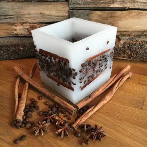 Viereckiges Windlicht mit getrockneten Kaffee und Zimt.