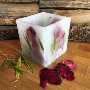 Viereckiges Windlicht mit getrockneten Rosenblättern und Bambus.
