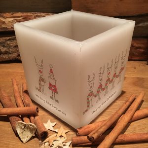 Die Windlichter sind mit Dekosteinchen und einem schönen Glas ausgestattet, in dass ein Teelicht oder eine kleine Stumpenkerze gestellt wird. Durch die hohe Transparenz des Wachses erleuchtet die Kerzenflamme das Motiv und hebt dieses auf sehr dekorative Weise hervor.